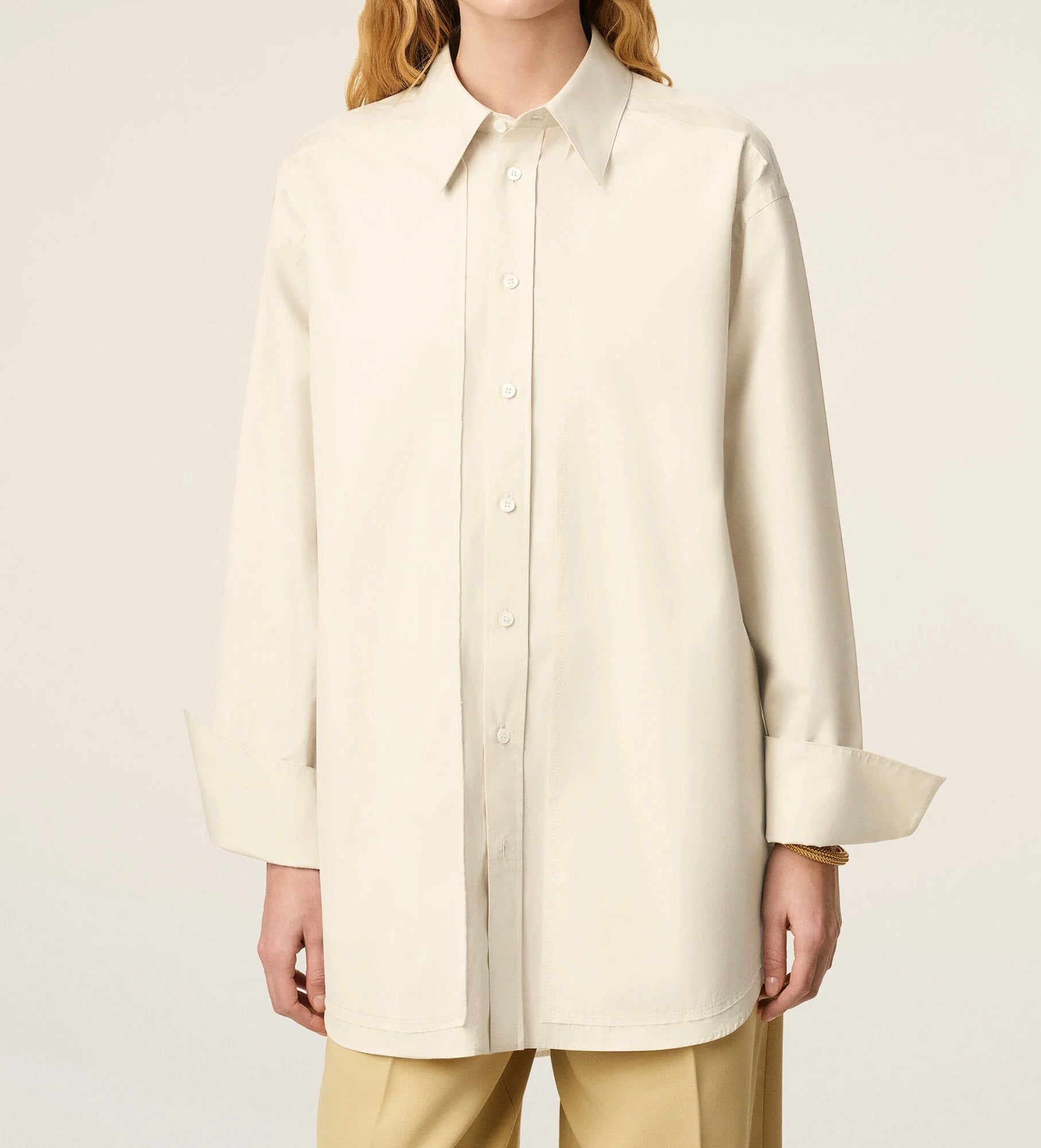 Long sleeves shirt with raw edged fabric applications in cotton poplin.