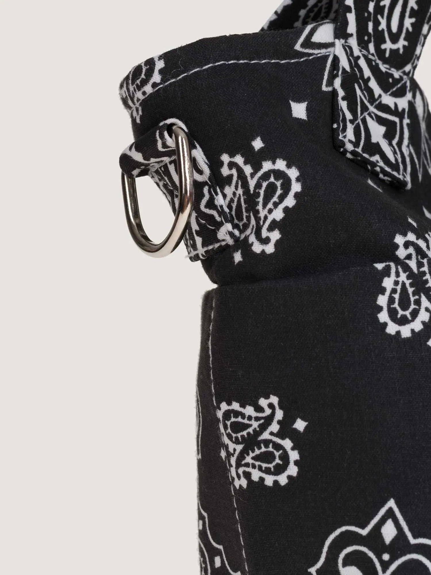 - On each side of the bag, half-moon rings offer the possibility of adding a shoulder strap (optional) or hanging charms to personalize it. Composition: 100% cotton. Bandanas made in the USA. Bag made in Europe. Care: Avoid washing our accessories unless absolutely necessary. Do not soak. Gently remove stains with a damp, soft cloth. Our bandanas are handmade. The dye baths may vary slightly from one production run to another. Dark colors tend to bleed slightly.