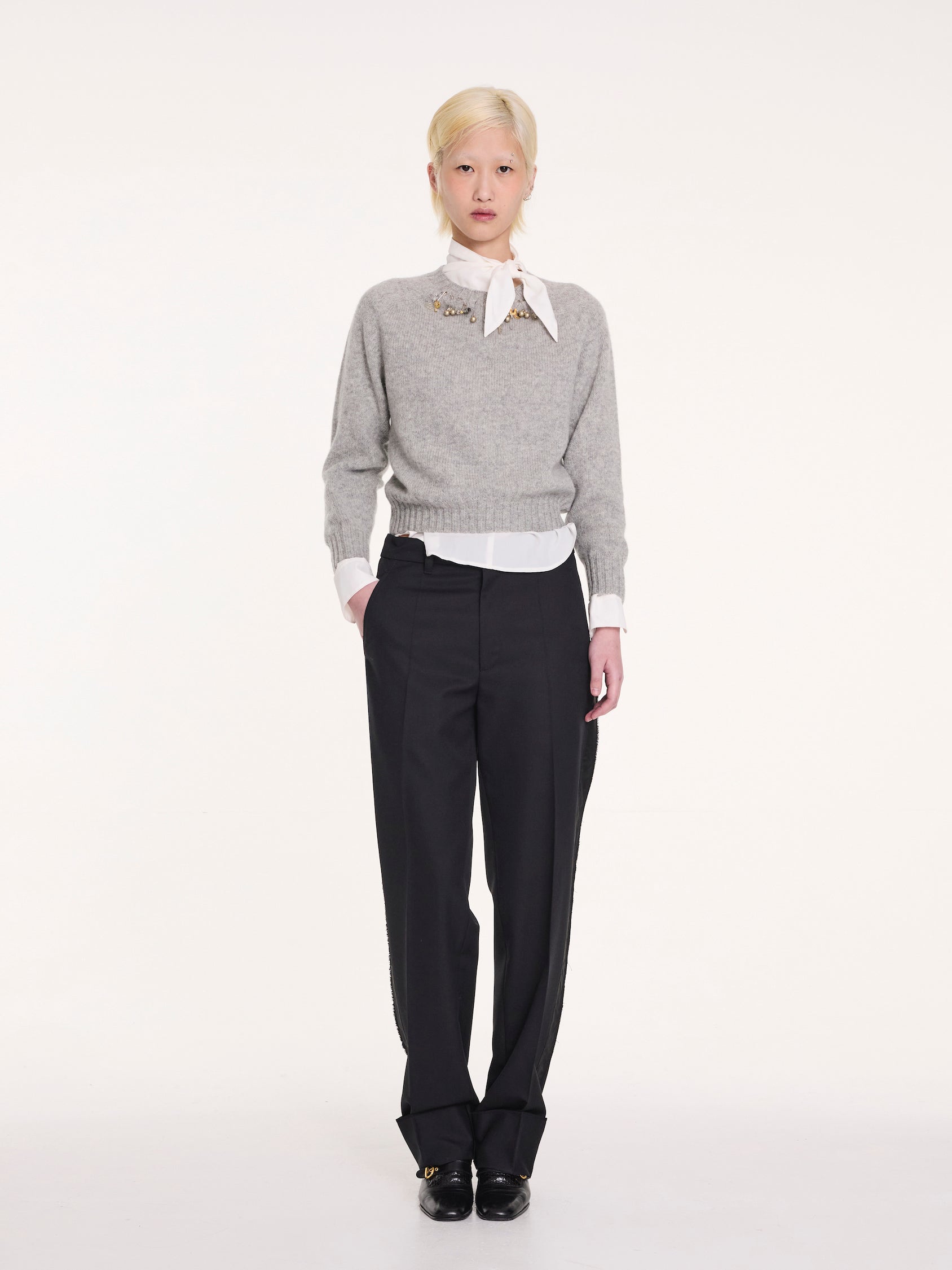 Clark crewneck shetland sweater with hand embellished "Les Interessants" details