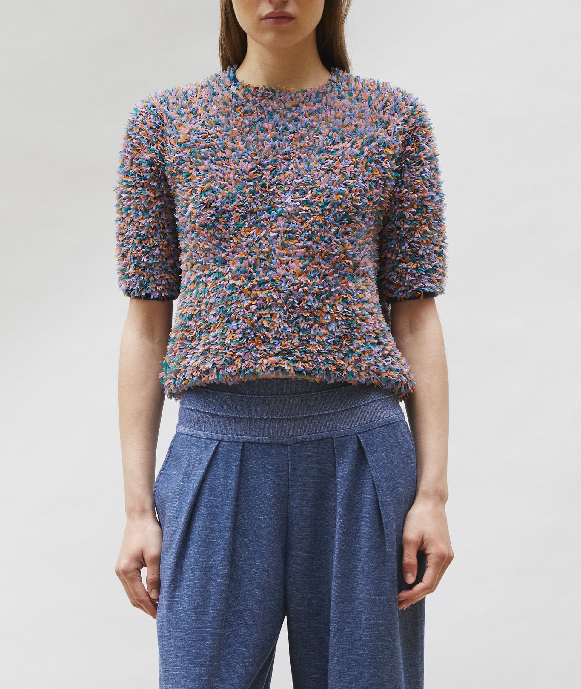 - Knitted wool base overlaid with a satin-stitched tulle yarn