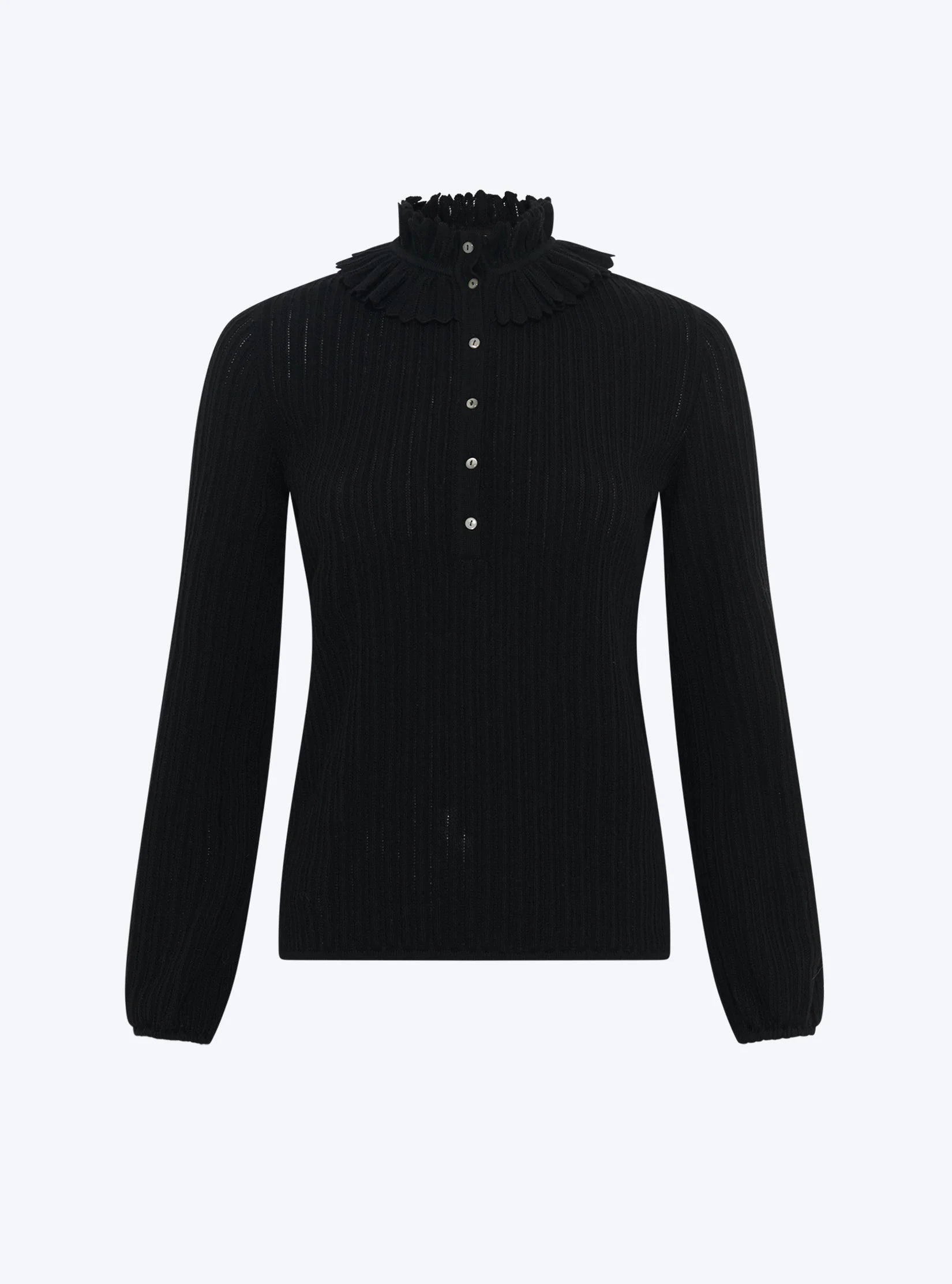 Graphic lace knit top in a mini herringbone knit with an airy double ruffled collar